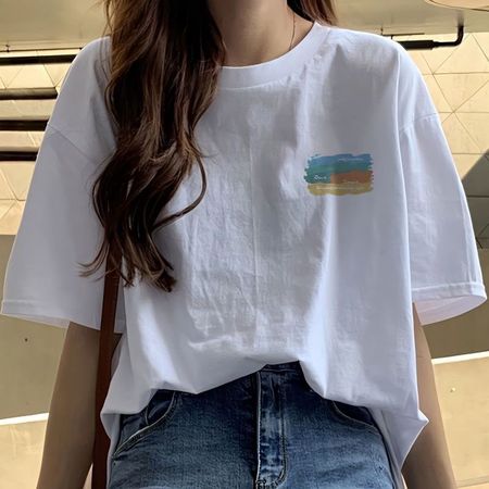 White Round Neck Straight Shoulder Short Sleeve T-Shirt Women's Top