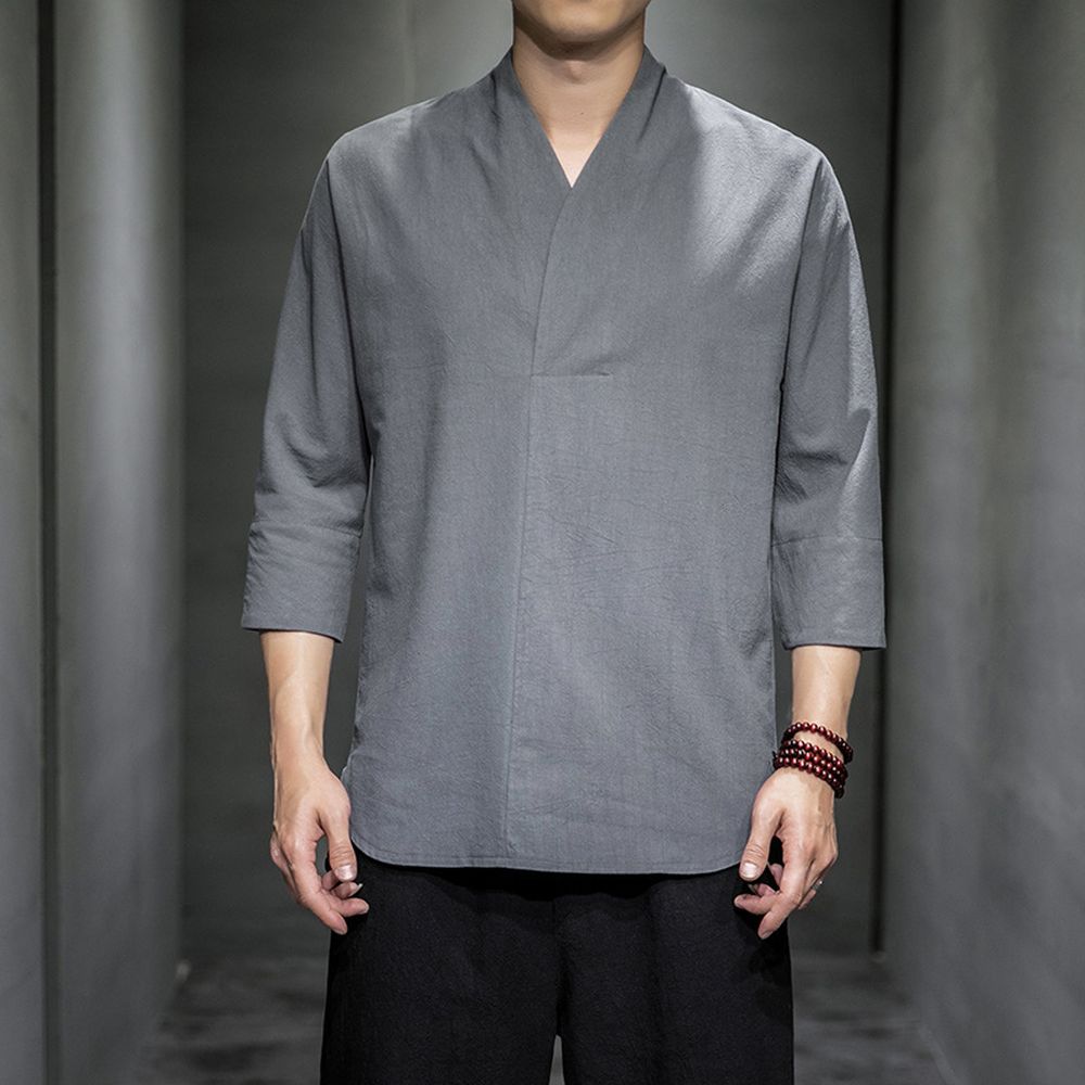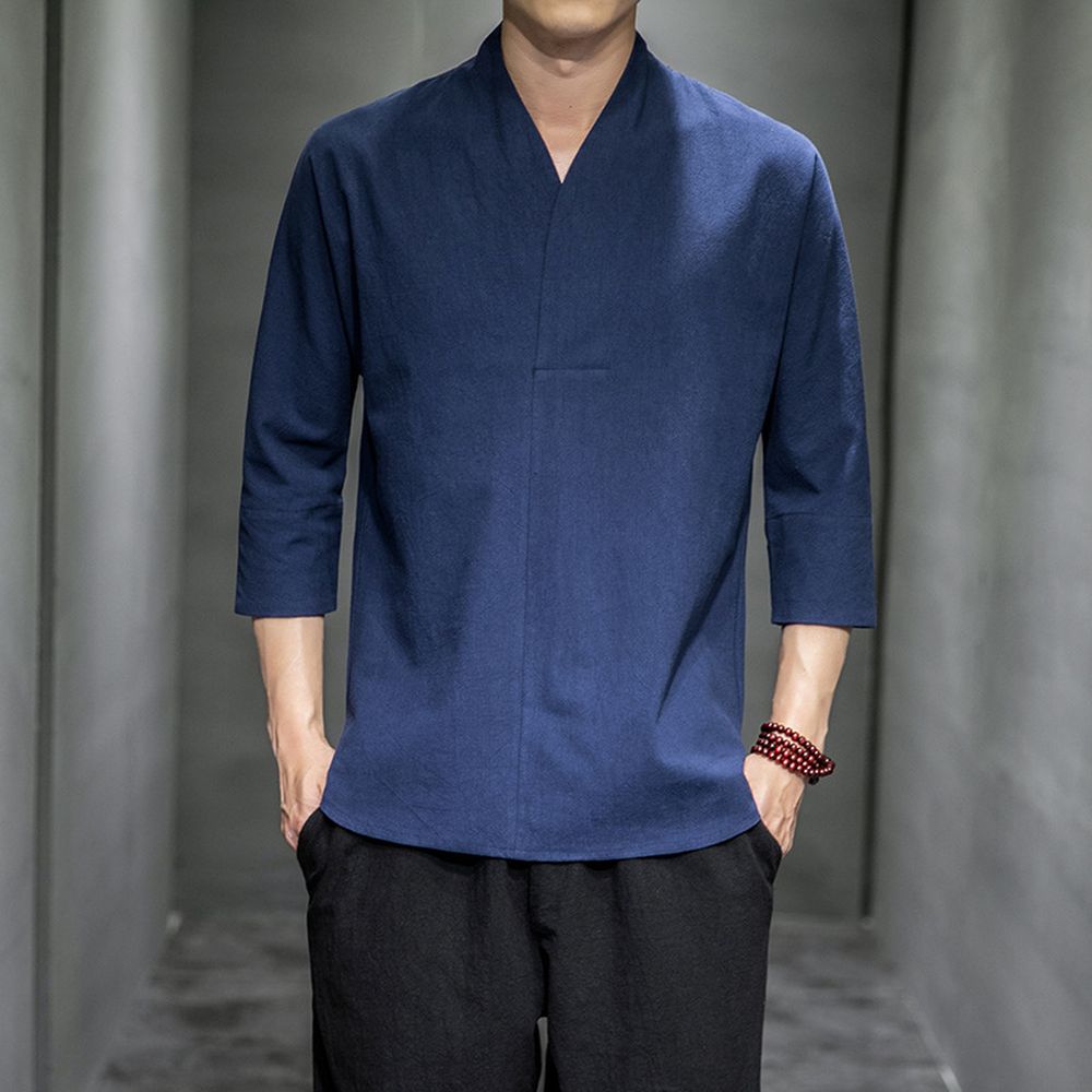 Men's Cotton And Linen Three-Quarter Sleeve Short-Sleeved T-Shirt Casual Retro